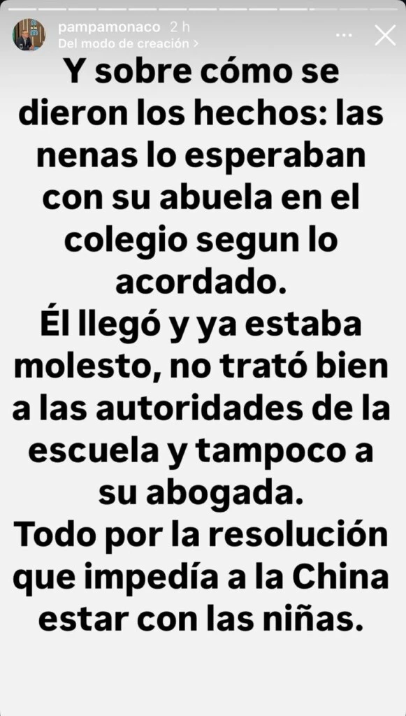 "Y sobre cómo se dieron los hechos: las nenas lo esperaban con su abuela en el colegio según lo acordado. Él llegó y ya estaba molesto, no trató bien a las autoridades de la escuela y tampoco a su abogada. Todo por la resolución que impedía a la China estar con las niñas", continuó diciendo el abogado especialista en policiales.