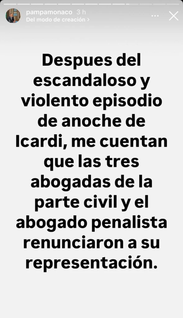 A su vez, el periodista Pampa Mónaco detalló: "Después del escandaloso y violento episodio de anoche de Icardi, me cuentan que las tres abogadas de la parte civil y el abogado penalista renunciaron a su representación".