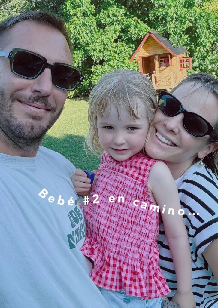 Además del video que grabaron del momento en que confirmó la noticia, Muni eligió una tierna postal familiar, con su marido Nicolás Naymark, y su hija Carmela, de tres años. "Bebé #2 en camino", escribió la artista sobre la imagen.