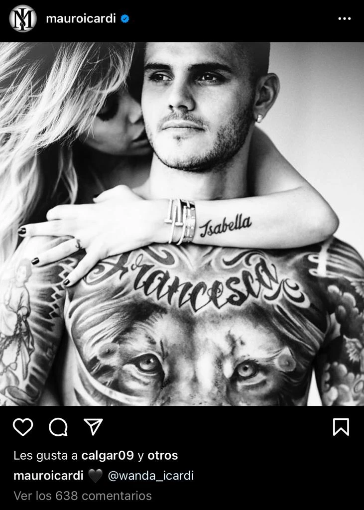 Esta mañana y luego del descargo de la China Suárez, Icardi subió a su feed un nuevo post en el que arrobó a la manager futbolística y compartió una imagen juntos que pertenece a un viejo shooting en blanco y negro en el que se ven claramente los tattoos que ambos se hicieron en honor de sus hijas, Isabella y Francesca.