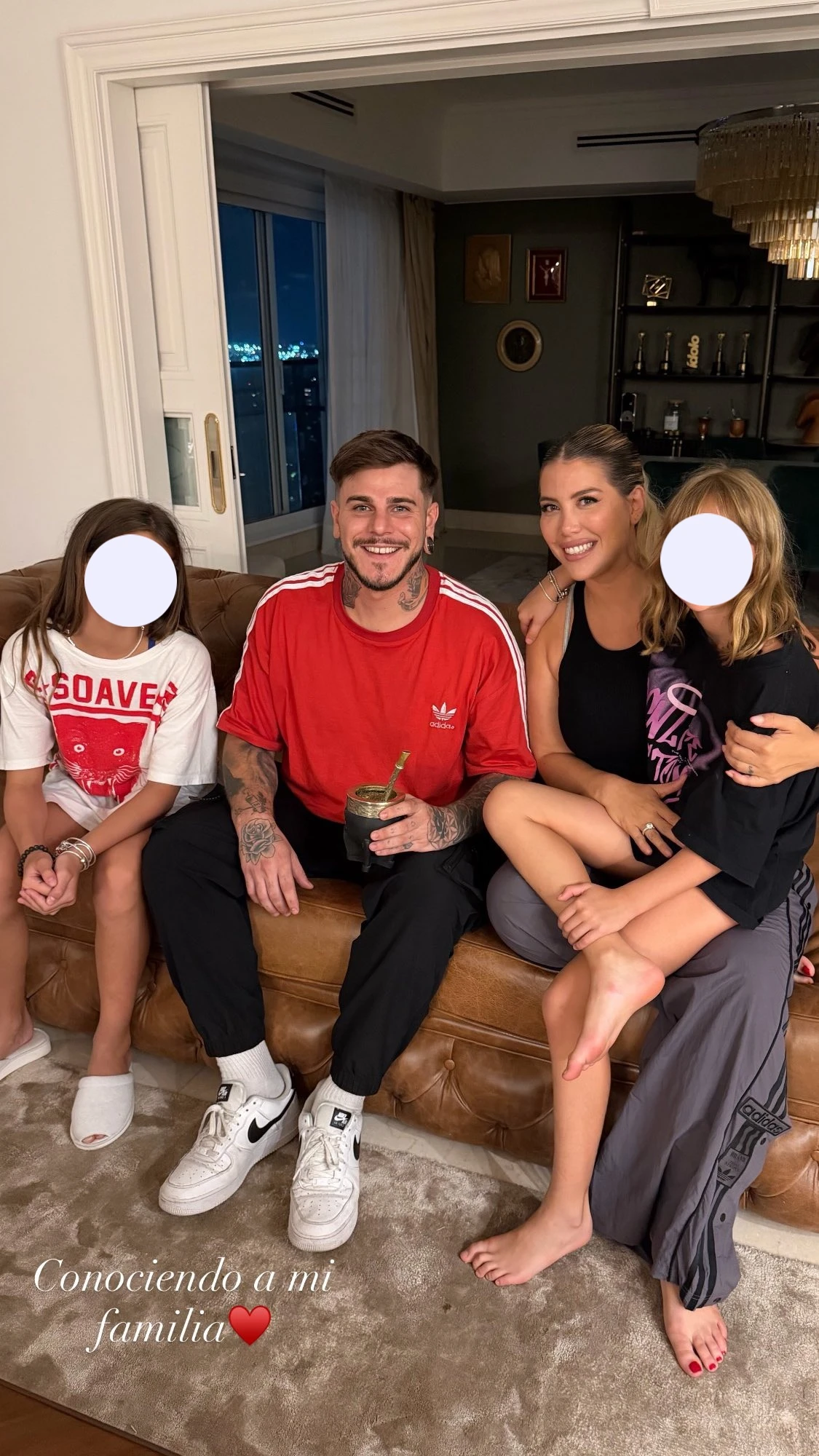 Guido Icardi, el hermano de Mauro, quedó en el medio de un escándalo mediático. Horas después de sus entrevistas televisivas, el tatuador subió a sus historias una serie de fotos que funcionaron como epílogo del día y, a la vez, como una toma de posición frente al presente de su familia. En la primera imagen, tomada en un living luminoso, él aparece con remera roja deportiva y tatuajes a la vista, sentado en un sillón de cuero. A su alrededor, Wanda Nara y sus hijas, Francesca e Isabella, posan cerca suyo en clima de confianza doméstica. Sobre la mesa baja se adivina una ronda que alterna mate y vasos; al fondo, una biblioteca y detalles de diseño dan marco de calidez. Debajo, una leyenda breve y contundente: “Conociendo a mi familia” y un corazón rojo.