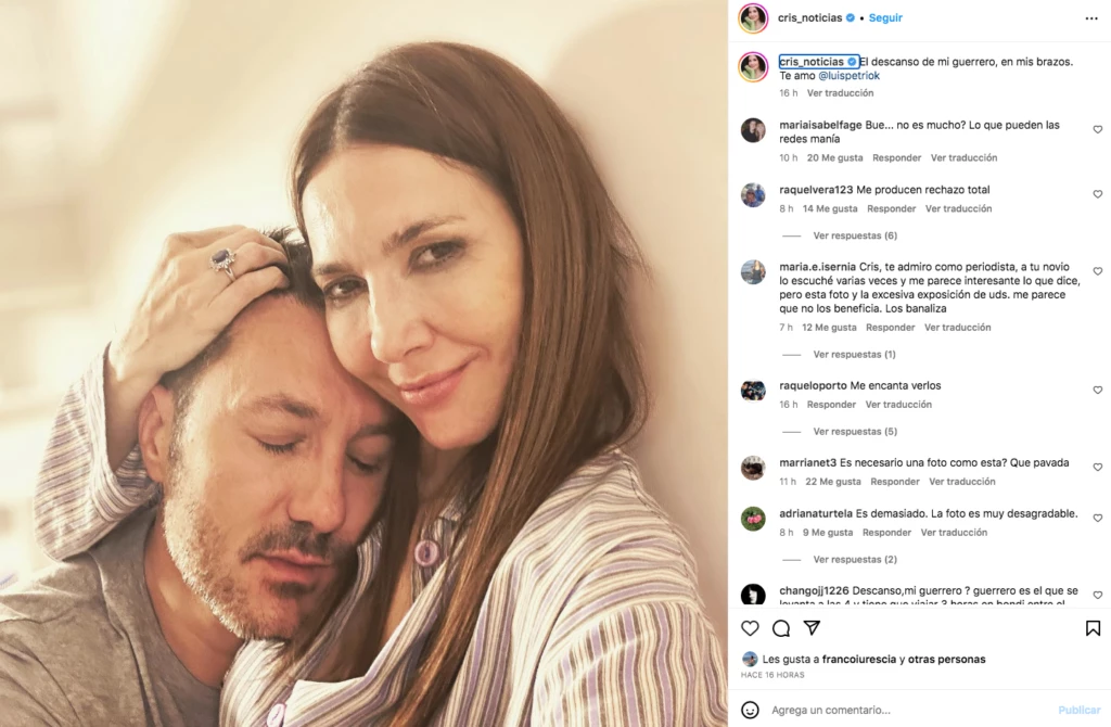 En las últimas horas, la periodista subió a sus redes una foto juntos y le dedicó unas sentidas palabras: "El descanso de mi guerrero, en mis brazos. Te amo @luispetriok". Actualmente, la pareja vive su amor a la distancia ya que él reside en Mendoza y ella, en Capital Federal. Eso sí, viajan con frecuencia para poder verse.