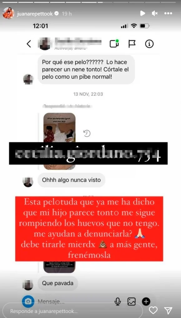 Juana Repetto se indignó por las amenazas a Chapu Martínez y se animó a compartir algunos de los tantos mensajes de odio que recibe a diario mediante Instagram. En este contexto, le contestó con firmeza a una seguidora que volvió a insultar a su hijo mayor, Toribio.