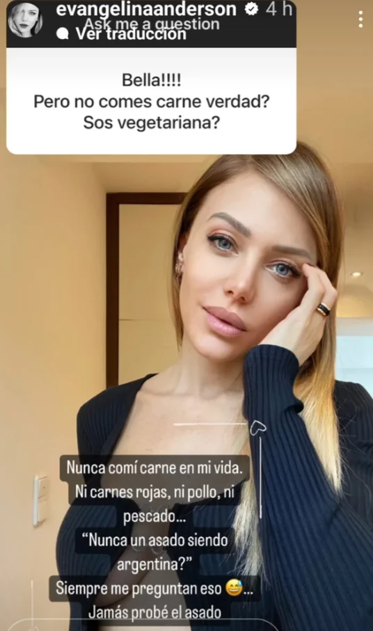 Uno de sus fans le consultó: "¿No comés carne? ¿Sos vegetariana?". Su respuesta sorprendió a todos: “Nunca comí carne en mi vida. Ni carnes rojas, ni pollo, ni pescado…’¿Nunca un asado siento argentina?’ Siempre me preguntan eso…Jamás probé el asado”.