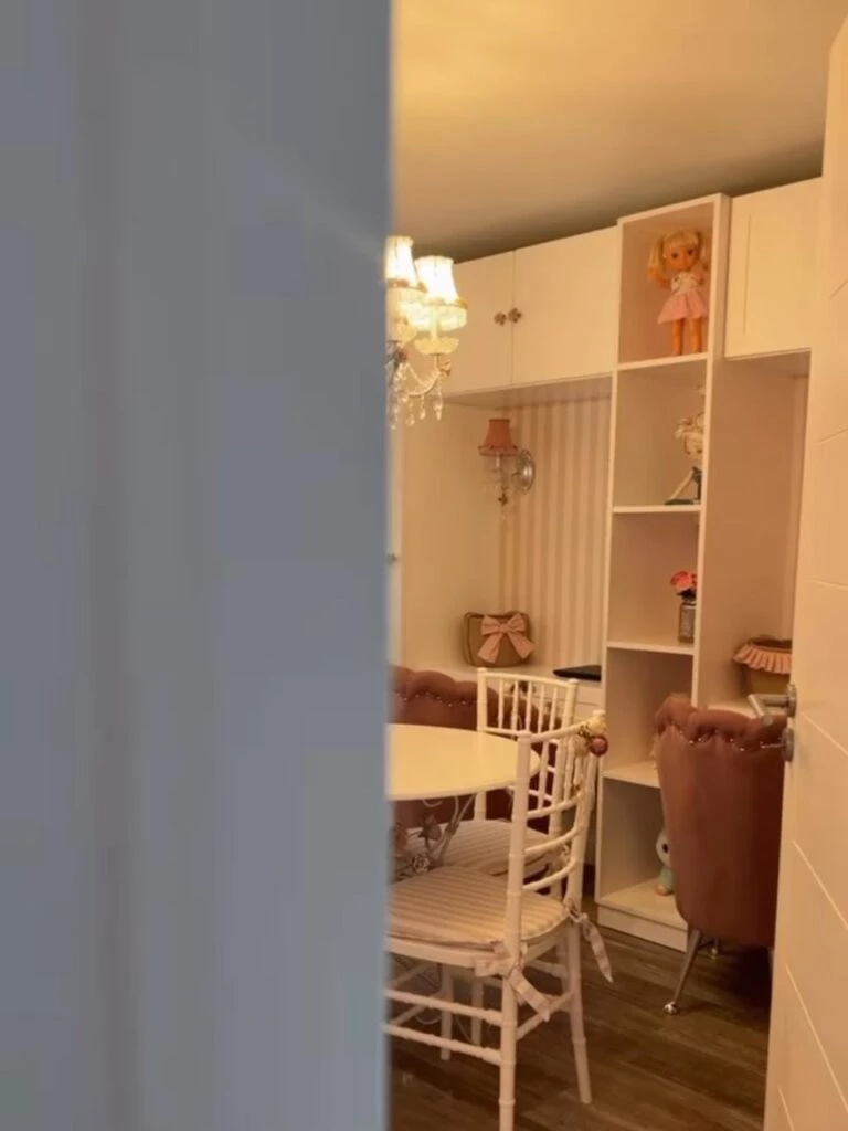 Los tonos blancos y rosas se apoderan de la cálida decoración del sector preferido de Lola. El espacio cuenta con un gran mueble con estantes en el que se presentan las muñecas de colección. También tiene un escritorio con un sillón de pana rosado con tachas plateadas.