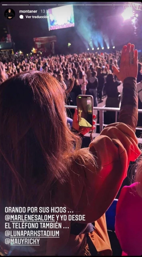 Pero, a nadie le pasó por el alto, la historia que Ricardo Montaner subió a cuenta de Instagram que decía: "Orando por sus hijos y yo desde el teléfono también" y se la ve a Marlene, con la mano en alto -como un pastor bendiciendo a sus seguidores- en pleno recital. No es raro que, a partir de alli, muchos la llamaran "La pastora Marlene".