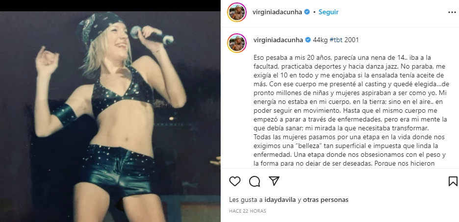 Virginia Da Cunha compartió una foto vintage de ella del año 2001. En ese entonces estaba comenzando su carrera musical junto a Bandana. La cantante utilizó este posteo para reflexionar sobre los cuerpos y los estándares de belleza hegemónicos.