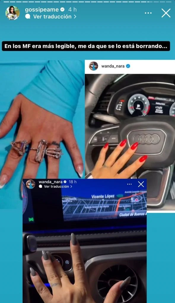 "En los MF era más legible, me da que se lo está borrando", comentó Pochi. Además de esta imagen y de la que mostró anteriormente en el auto, la influencer agregó una foto que subió Wanda a su Instagram el 24 de septiembre, donde también mostraba su mano sobre el volante del auto, y se veía borroso el tatuaje del dedo anular.