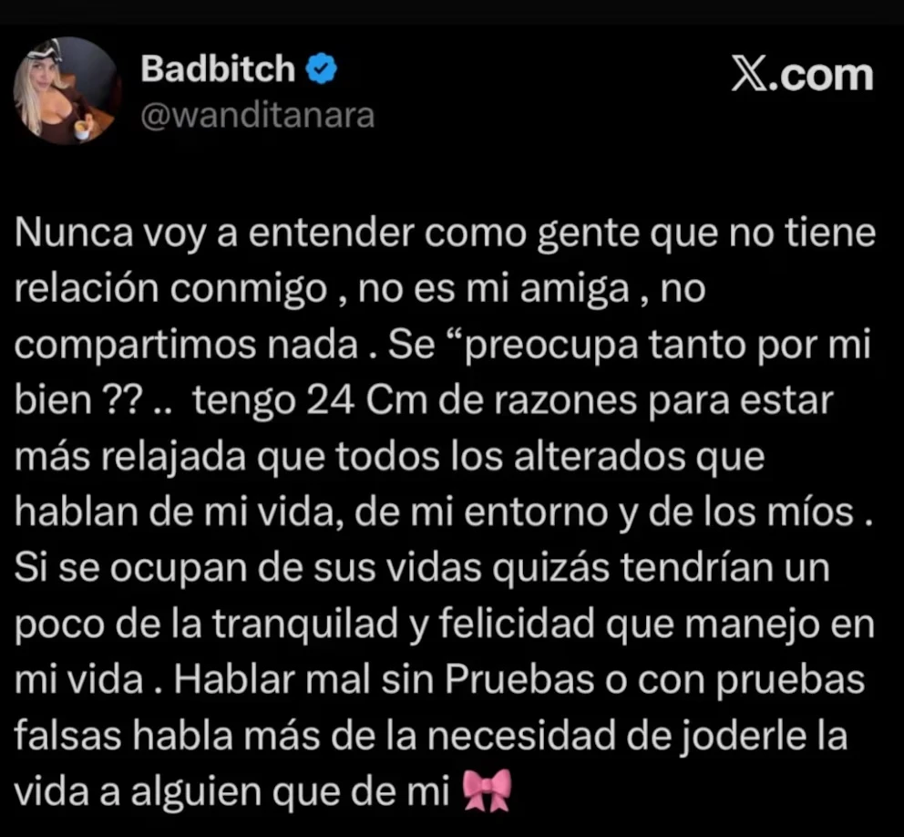 La pregunta que detonó la reacción hacía referencia a los rumores sobre la intimidad de la pareja, que habían cobrado fuerza en redes tras un polémico posteo de Wanda en X (ex Twitter) donde escribió: “Tengo 24 cm de razones para estar más relajada que todos los alterados”. Aunque la conductora borró el mensaje, el tema se instaló y el cronista no dudó en consultarlo. La respuesta de Migueles fue contundente: sin palabras, solo aceleró.