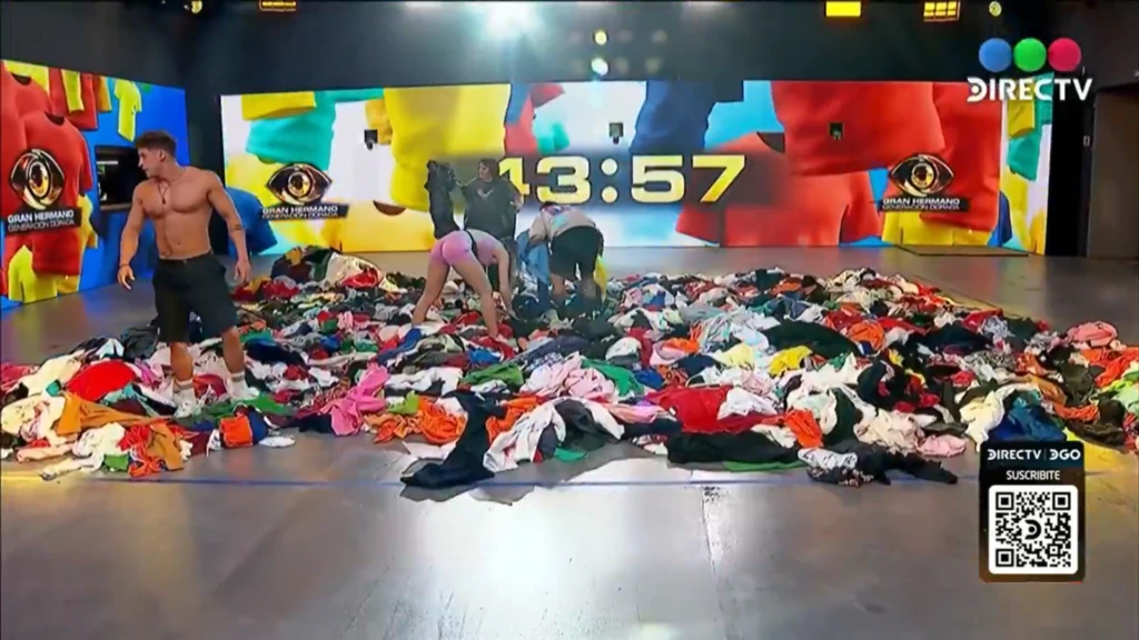 La consigna parecía sencilla y, al mismo tiempo, un clásico de Gran Hermano: encontrar una remera con el nombre de cada participante dentro de una montaña de prendas mezcladas. El estudio montó un paisaje de telas de todos los colores y los jugadores se lanzaron al desafío con la adrenalina habitual de las pruebas semanales. A medida que los minutos corrían y el reloj gigante marcaba la presión del directo, uno a uno fueron levantando su remera, mostrándola a cámara y apartándose para dar lugar a quienes todavía seguían revolviendo el mar de algodón y poliéster. La escena dejaba imágenes vibrantes, ruido de pasadas frenéticas y frases de aliento que se escuchaban de fondo: “Seguí, amigo, dale”.