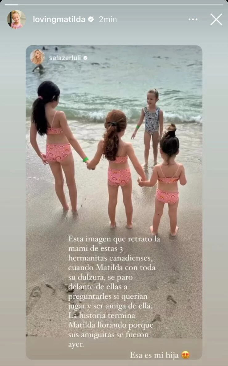Matilda Salazar se encuentra disfrutando del receso escolar de invierno en Miami junto a su mamá, Luciana Salazar. Allí, la mini influencer de cinco años aprovecha para meterse al mar y jugar en la playa. En ese sentido, la actriz y modelo, compartió en sus redes una conmovedora historia de amistad que debió llegar a su fin por las vueltas de la vida.