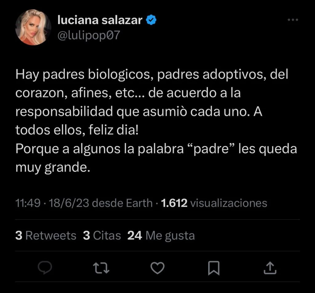 "Hay padres biológicos, padres adoptivos, del corazón, afines, etcétera... de acuerdo a la responsabilidad que asumió cada uno. A todos ellos, ¡feliz día! Porque a algunos la palabra 'padre' les queda muy grande", expuso tanto en Twitter como en Instagram.