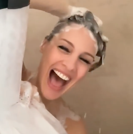 "No, no", respondió Pampita –mientras continuaba refregándose el pelo con shampoo– y enseguida puso punto final a la divertida charla en el baño del camarín: "Bueno, me apuro".
