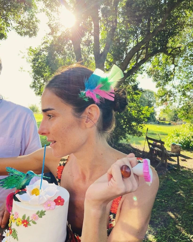 A cara lavada y acompañada por los más íntimos, la conductora pidió sus tres deseos apagando una velita turquesa que se encontraba sobre una torta decorada con un colibrí turquesa y varias flores que fue confeccionada especialmente para ella.