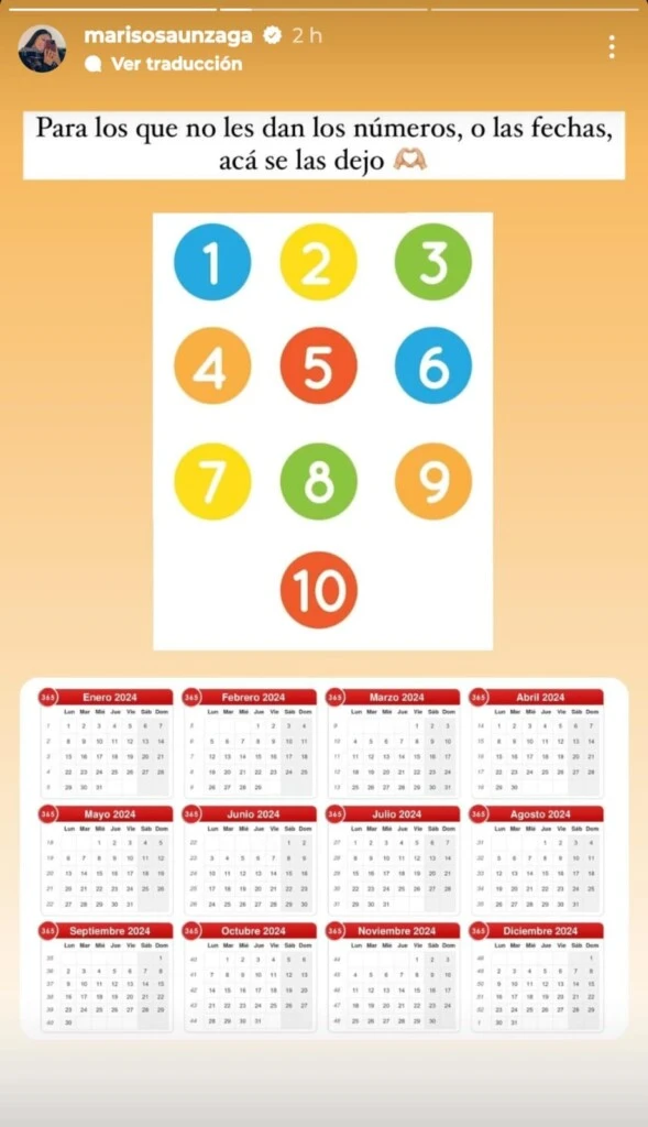 Mientras que, su novia puso en sus historias de Instagram con ironía: "Para los que no le dan los números, o las fechas. Acá se las dejo", escribió y sumó literal una imagen con los números del 1 al 10 y otra con el calendario 2024, en respuesta a los comentarios que dejaron algunos.