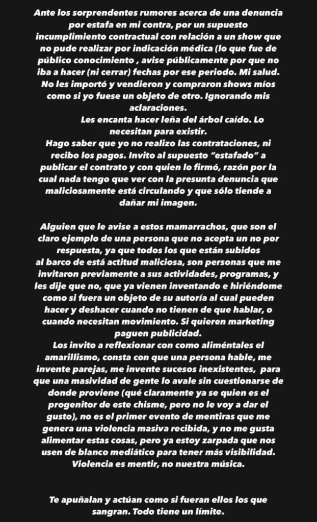 En ese contexto, la cantante emitió una contundente respuesta. "Ante los sorprendentes rumores acerca de una denuncia por estafa en mi contra, por un supuesto incumplimiento contractual con relación a un show que no pude realizar por indicación médica, lo que fue de público conocimiento, avisé públicamente por qué no iba a hacer (ni cerrar) fechas por ese período. Mi salud", comenzó diciendo.