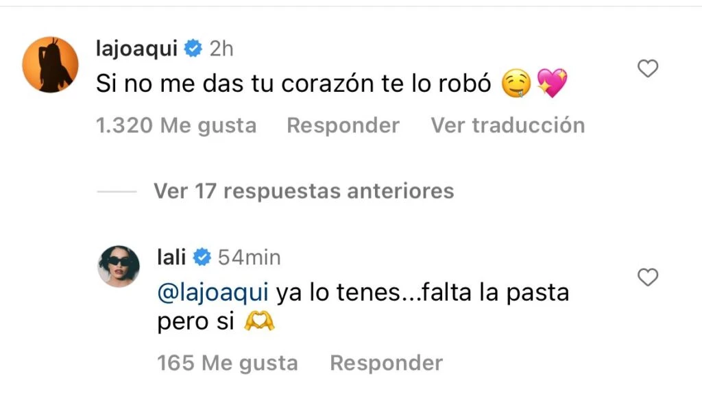 La Joaqui se sintió impactada y no dudó en decirlo públicamente. La cantante de trap, que siempre habla de la importancia del apoyo entre las mujeres de la industria, comentó: “Si no me das tu corazón te lo robo”, e incluyó dos emojis: uno con una carita babosa, y un corazón con destellos. A lo que Lali, sin quedarse atrás, le respondió: "Ya lo tenés... falta la pasta, pero sí".