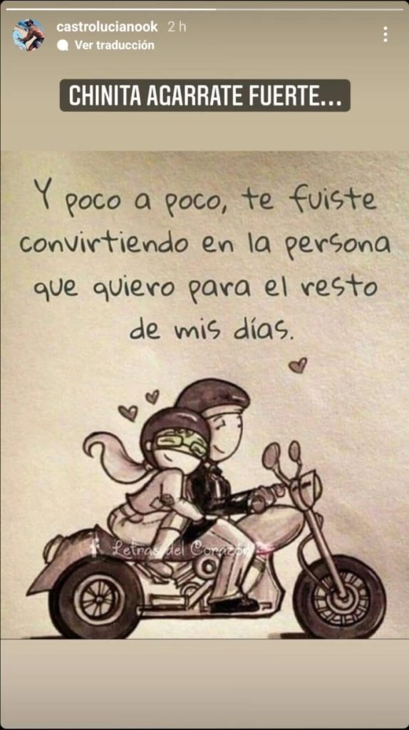 Ahora le tocó a Castro enviarle un mensaje a la bailarina a través de sus redes sociales. El actor compartió una imagen donde se lee, "Y poco a poco, te fuiste convirtiendo en la persona que quiero para el resto de mis días" y el actor le agregó "Chinita agarrate fuerte..." haciendo una clara referencia a Flor Vigna.