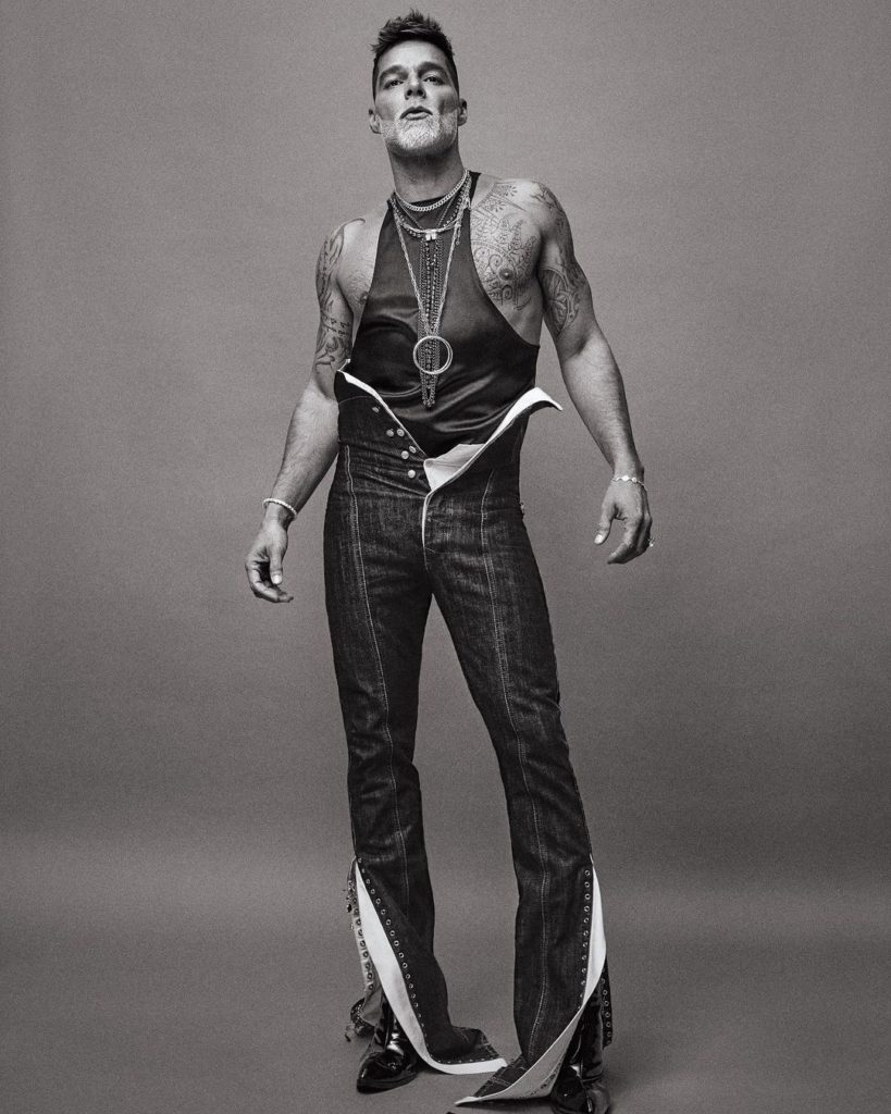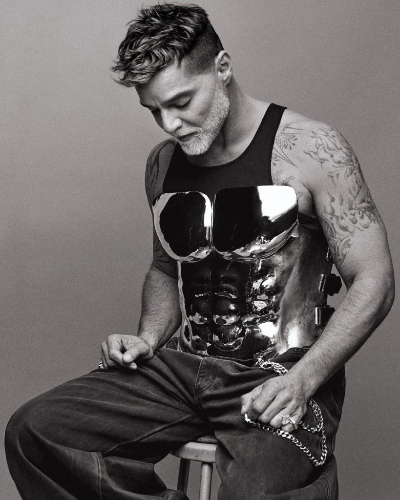 En esta súper producción, el cuerpo de Ricky Martin, de 49 años, está adornado con joyas de distintas firmas, como Dear Letterman, especializada en accesorios ecológicos y unisex. En otra de las fotos tomadas por Isaac Anthony, el cantante posa con una armadura.