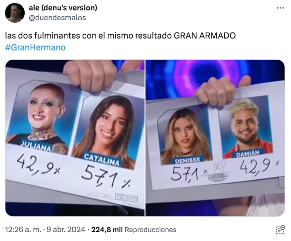 Otra usuaria se sumó al enojo en X y expresó: "Las dos fulminantes con el mismo resultado. Gran armado". De esta manera, recordó que las dos fulminantes que se hicieron, Juliana contra Dennise y Emmanuel contra Catalina, salieron de la casa con el mismo porcentaje.