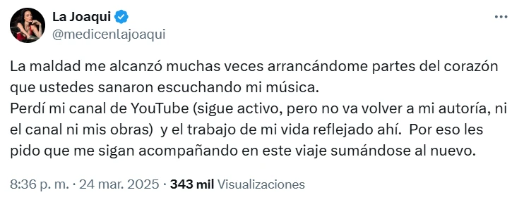 Y agregó: "Perdí mi canal de YouTube (sigue activo, pero no va volver a mi autoría, ni el canal ni mis obras) y el trabajo de mi vida reflejado ahí. Por eso les pido que me sigan acompañando en este viaje sumándose al nuevo".