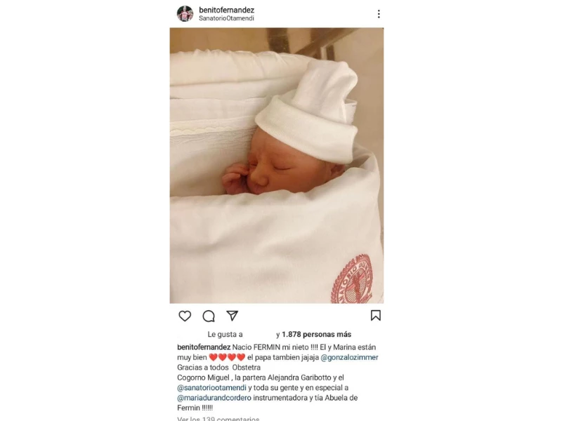 A través de su cuenta oficial de Instagram, el diseñador contó la feliz noticia junto a la primera fotodel bebé. "Nació mi nieto Fermín. Él y su mamá están bien, y su papá también", escribió Benito, muy emocionado por ser abuelo por primera vez.
