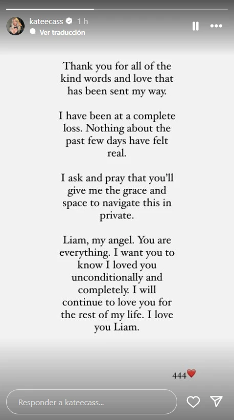 "Les pido y ruego que me den la gracia y el espacio para atravesar esto en privado. Liam, mi ángel. Eres todo para mí. Quiero que sepas que te amé incondicional y completamente. Seguiré amándote por el resto de mi vida. Te amo, Liam", cerró emocionada.