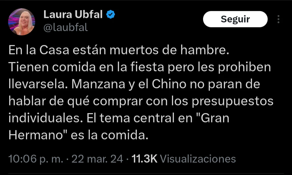 "En la Casa están muertos de hambre. Tienen comida en la fiesta pero les prohiben llevarsela. Manzana y el Chino no paran de hablar de qué comprar con los presupuestos individuales. El tema central en "Gran Hermano" es la comida", escribió la panelista.