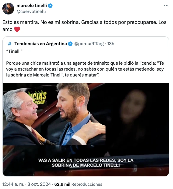 Durante las últimas horas, Marcelo Tinelli se vio envuelto en un escándalo, luego de que se viralizara un video de una mujer, que afirmaba ser su sobrina, tratando mal a una agente de tránsito. Ante esto, el conductor compartió un tajante mensaje en sus redes sociales.