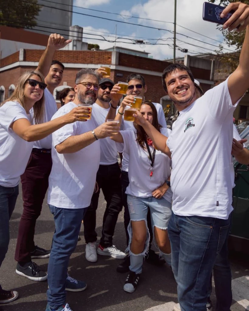 El jurado, que tiene un casco amarillo para conducir, también brindó con cerveza con sus amigos después de que todos recibieran una remera blanca con la estampa del grupo en la espalda.