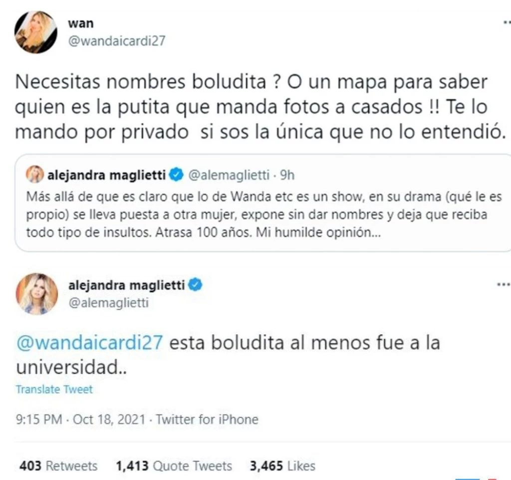 Wanda no se quedó callada y le respondió a la panelista "Necesitas nombres boludita? O un mapa para saber quién es la putita que manda fotos a casados!!.Te lo mando por privado si sos la única que no lo entendió" le contestó la esposa de Mauro Icardi a Maglietti. Luego de unos minutos la mediática decidió borrar el tweet pero el mensaje ya se había viralizado.