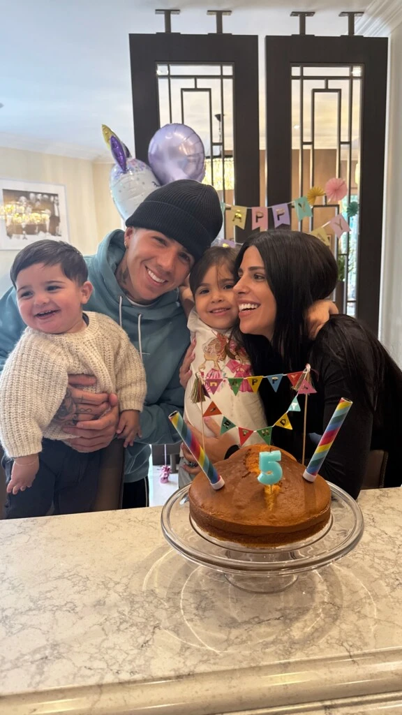 Este miércoles la familia de Enzo Fernández y Valentina Cervantes vive con mucha alegría el cumpleaños de Olivia, su primera hija. Desde sus redes sociales hicieron varios posteos y entre ellos se pudo ver una bella postal familiar por los cinco años de la pequeña, en la que se los ve a los cuatro juntos, con el pequeño Benjamín de un año.