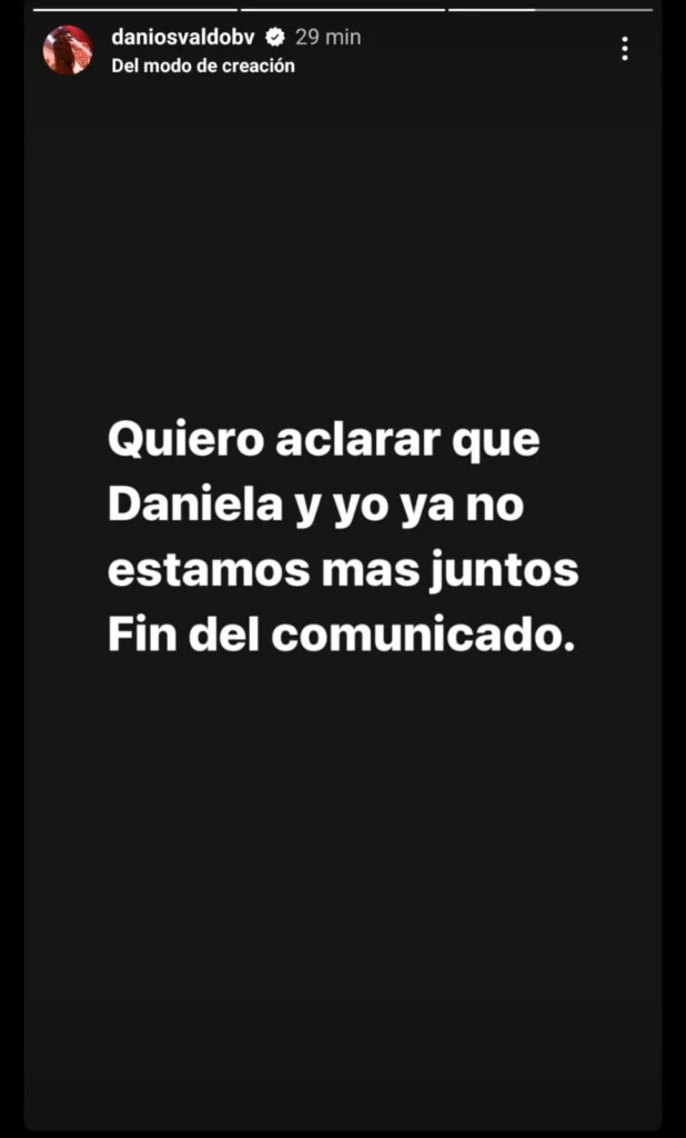“Quiero aclarar que Daniela y yo ya no estamos más juntos. Fin del comunicado”, había escrito en su cuenta de Instagram. Minutos más tarde, luego de que comenzara un debate acerca de presuntas infidelidades de su parte, Osvaldo agregó picante: "¿Tercera o tercero? Averigüen bien, chiquis", dando a entender que quien habría sido engañado por su pareja en realidad habría sido él.