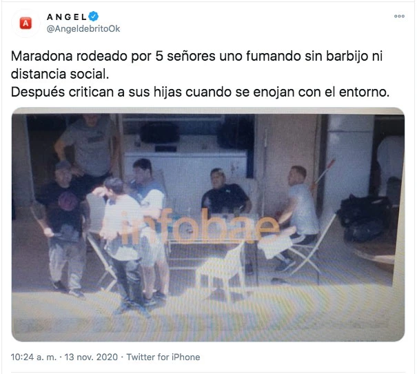 Mientas está en plena recuperación, el periodista Ángel de Brito compartió una foto que publicó Infobae, en la cual Diego parece estar muy poco seguro teniendo en cuenta la pandemia de coronavirus.