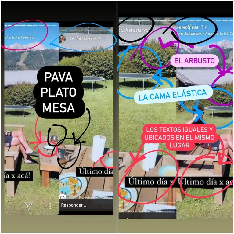 Como si eso no fuera suficiente, sumó más pruebas a la causa. En ambas publicaciones se puede ver el mismo texto: “¡Último día por acá!”. “Están la misma pava, el mismo plato y la misma cama elástica. Entonces, si son amigos, ¿por qué no se sacan una foto juntos?”, deslizó la periodista, desafiante.