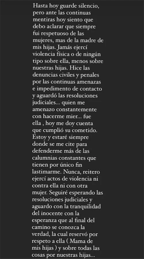 Luego de escuchar a su ex, Defederico le contestó con un texto que publico en su cuneta de Instagram, en el cual negó que haya ejercido violencia sobre ella o alguna de las nenas.