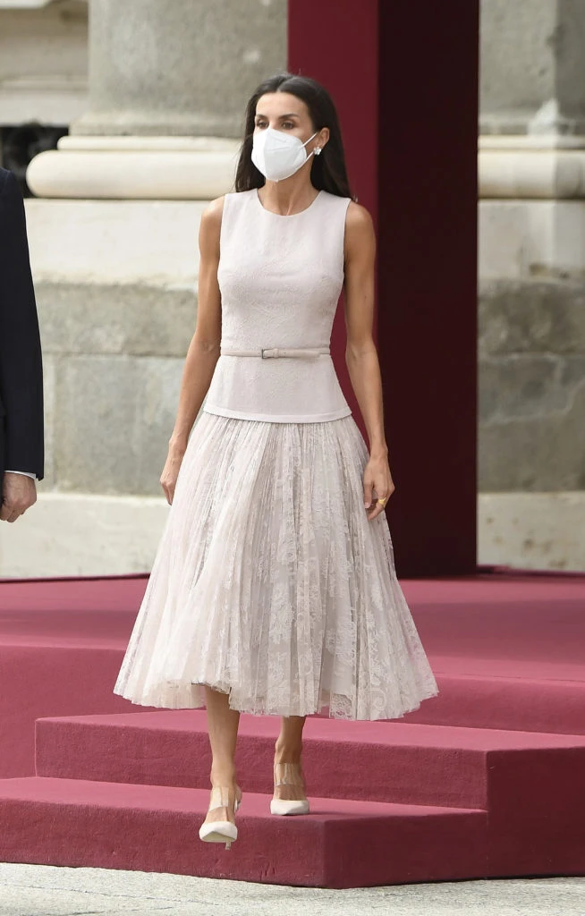 Devota del reciclado como su par holandesa, Máxima Zorreguieta, y llamada la "reina de la economía", Ortiz optó por un outfit en color nude firmado por el diseñador Felipe Varela.