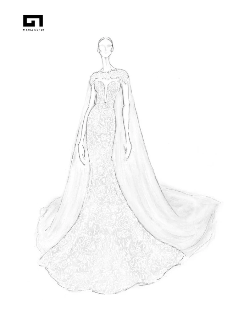 De acuerdo a lo que reveló la diseñadora, el vestido se destaca por su construcción corsetera de escote corazón profundo y cintura ceñida al cuerpo. La falda protagonista es en línea mermaid de quillas en bajo ruedo en caída al bies.