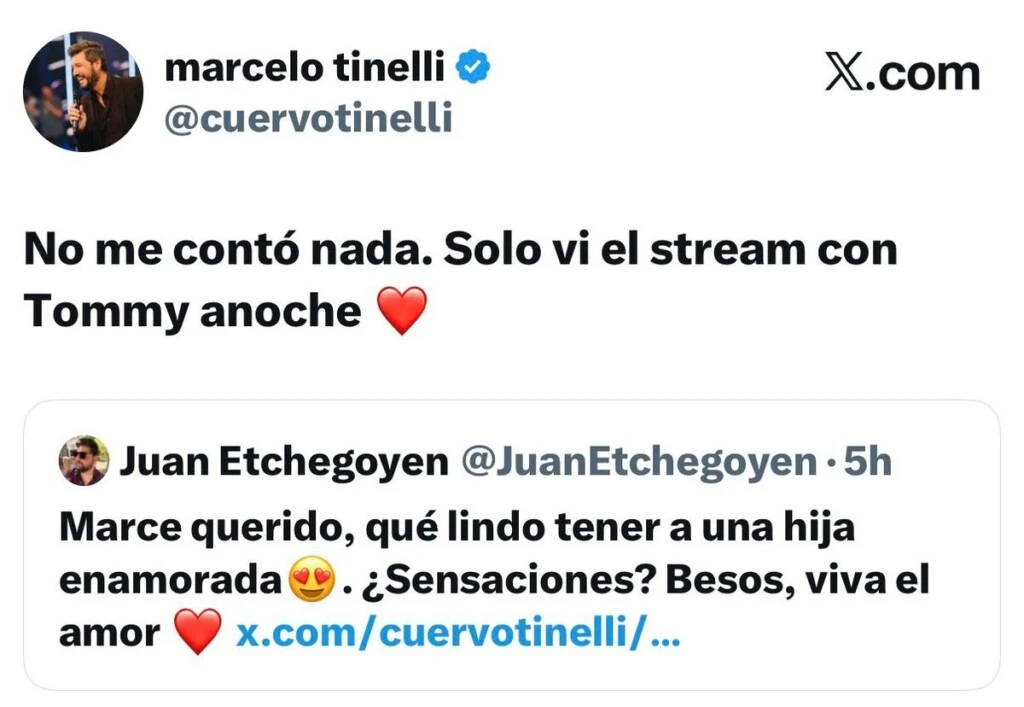 Tras la exposición pública del romance, el periodismo fue en busca de la palabra de Marcelo Tinelli. El primero en obtener respuesta fue Juan Etchegoyen, quien le escribió al conductor a través de X (ExTwitter) para conocer sus sensaciones. Fiel a su estilo frontal, Tinelli contestó sin rodeos y con un mensaje que dejó clara su postura frente a la relación de su hija.