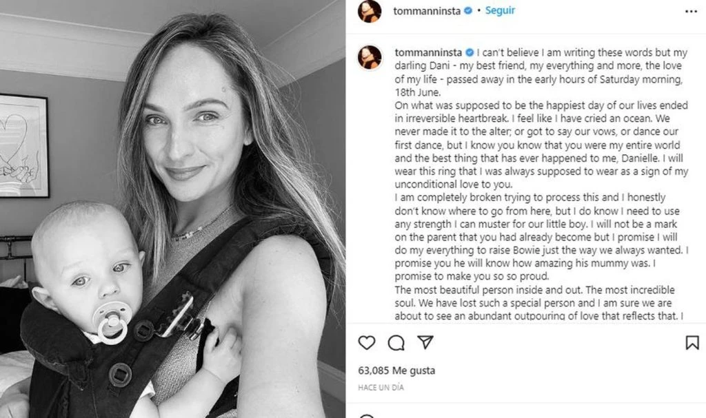 Mann explicó lo que pasó con su pareja, Danielle Hampson, quien tenía 34 años. “Mi querida o Dani, mi mejor amiga, mi todo y más, el amor de mi vida, falleció en la madrugada del sábado 18 de junio. Lo que se suponía que sería el día más feliz de nuestras vidas, terminó con mi corazón roto. Siento que lloré un océano”, escribió.