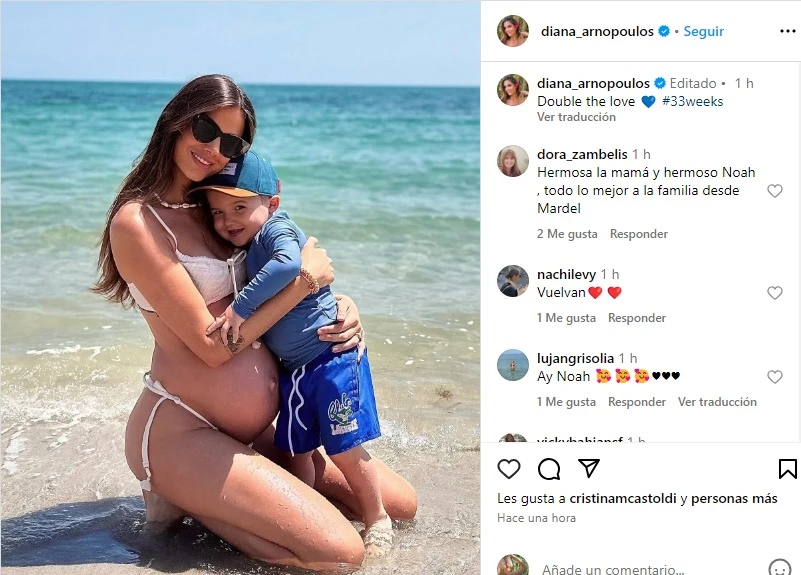 Con la leyenda “double the love” la modelo y empresaria lució su panza con alegría y emoción. En la imagen, Arnopoulos luce un traje de baño color blanco y se encuentra abrazada a su primer hijo mientras disfrutan de la playa.