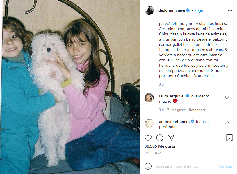 Y concluyó: "Hoy es uno de esos días en el que fantaseo volver a esa parte de mi infancia, donde el tiempo parecía eterno y no existían los finales. A caminar con tacos de mi tía, a mirar Chiquititas, a la casa llena de animales, a tirar pan con barro desde el balcón y cocinar galletitas sin un límite de tiempo, a tener a todos mis abuelos. Si volviera a nacer quiero otra infancia con la Cuchi y sin dudarlo con mi hermana que fue, es y será mi sostén y mi compañera incondicional. Gracias por tanto Cuchita".