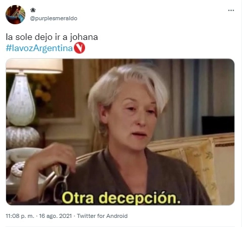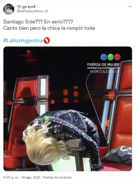 Sin embargo, tras unos minutos de mostrarse dubitativa, La Sole aseguró: "No sé si irme por el show y todo -mira a Johana- o irme por la voz - haciendo referencia a Santiago- aunque sé que tengo que tomar una decisión. Voy a confiar en lo que sentí mientras los escuchaba cantar a ambos. Se queda en mi equipo Santiago".