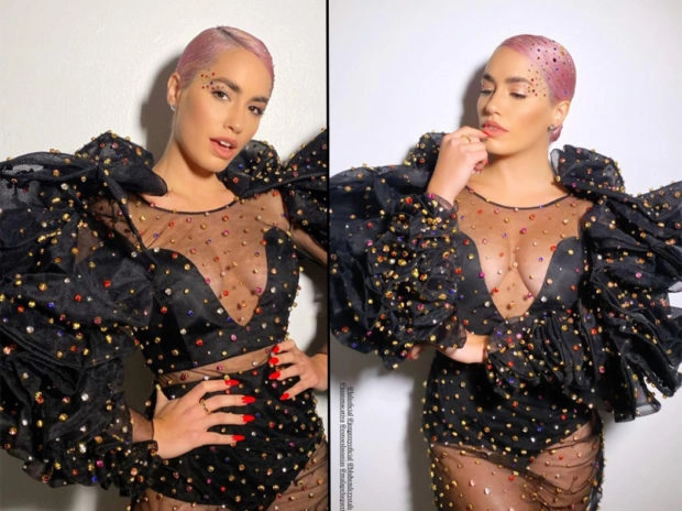 El creador nacido en Rufino, Santa Fe, es el autor del top y maillot cubierto por tul bordado con cientos de cristales Swarovski que remata con voluminosas mangas, una de las tendencias que sigue presente en las nuevas colecciones 2022.