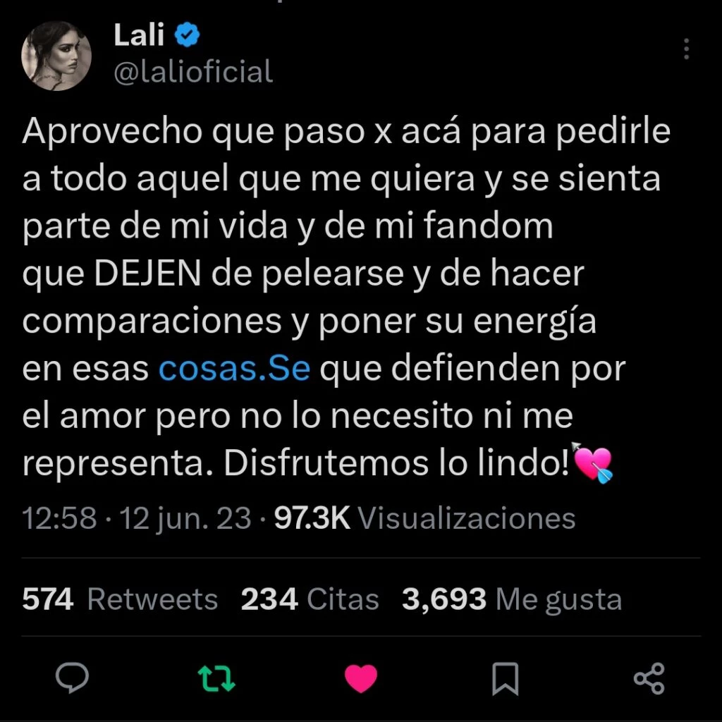 “Aprovecho que paso por acá para pedirle a todo aquel que me quiera y se sienta parte de mi vida y de mi fandom que dejen de pelearse y de hacer comparaciones y poner su energía en esas cosas. Sé que defienden por el amor pero no lo necesito ni me representa. Disfrutemos lo lindo”, aseguró a través de sus redes sociales. A lo que sus seguidores aceptaron hacer las pases por el momento.
