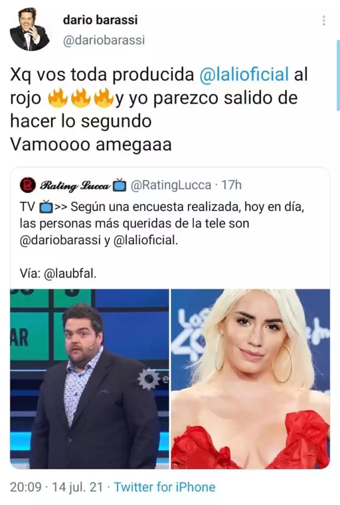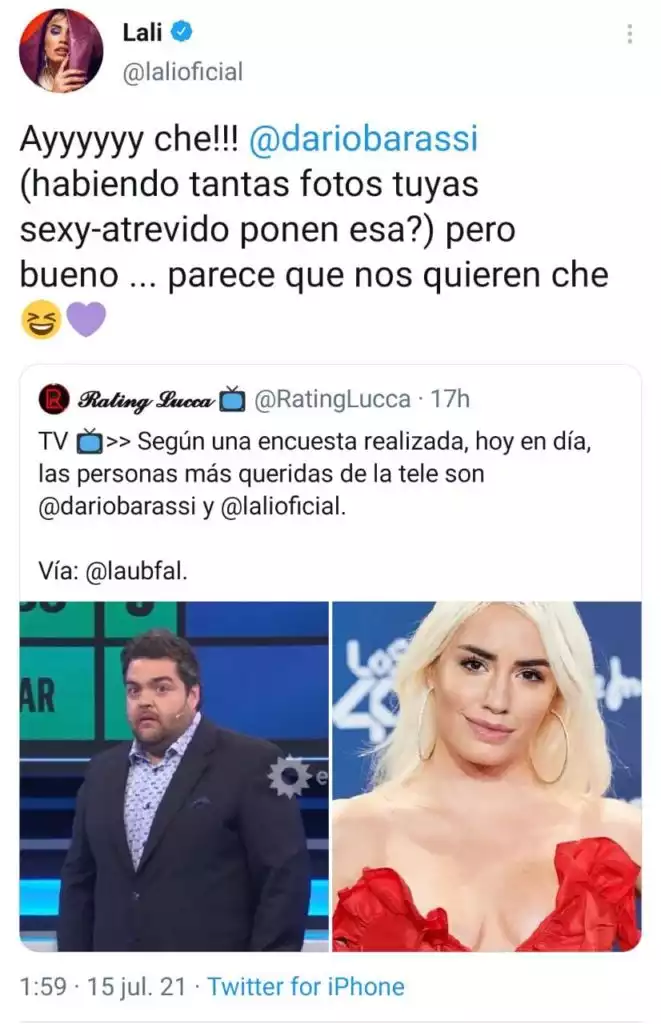 Enterados de la encuesta, ambos no dudaron en replicarlo en sus cuentas de Twitter e incluso intercambiar pícaros mensajes. El actor fue el primero en reclamar por la elección de su foto en el tweet sobre la encuesta. "¿Por qué vos toda producida al rojo fuego y yo parezco salido de hacer lo segundo? ¡Vamos amiga!", escribió agregándole su cuota de humor sobre su fotografía en "110 argentinos dicen" y la de Lali durante una red carpet de una premiación.