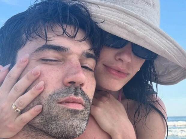 En otra toma, la misma joya aparece en primer plano sobre una mesa con objetos personales, libros y una botella de vino, reforzando la idea de que fue un momento íntimo y pensado. Finalmente, hay una foto en la playa, donde la pareja se abraza frente al mar, transmitiendo la complicidad que los caracteriza.