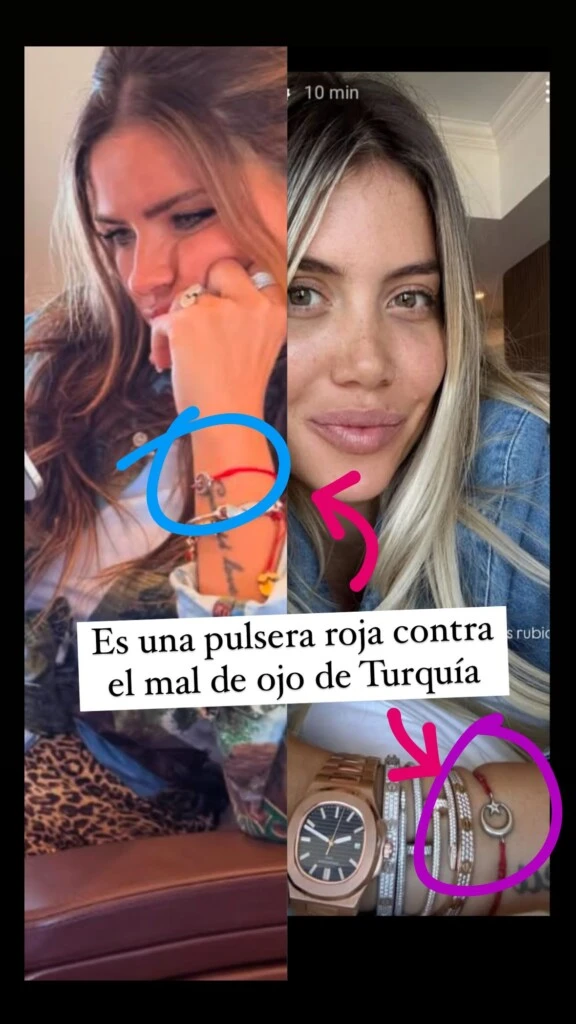 3) La pulsera: la vida de Wanda y La China en Turquía no solo se ve reflejada en el acompañamiento al delantero del Galatasaray. Las dos mujeres coincidieron una vez más en un detalle de joyería: se trata de una pulsera roja con el detalle de la luna y la estrella, el símbolo que aparece en la bandera del país de Medio Oriente.