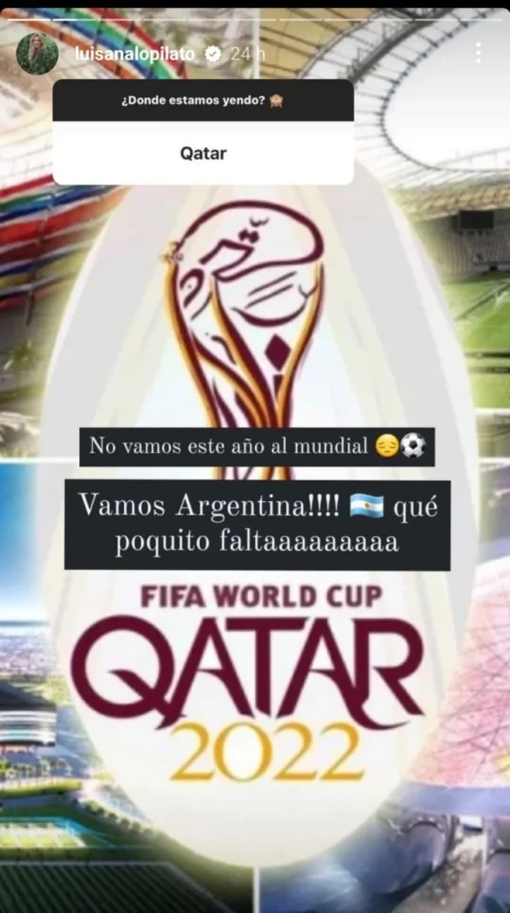 Esperando a que su esposo cumpla con sus obligaciones laborales, la intérprete, que dará vida nuevamente a Paola Argento, adelantó que muy pronto volverá al país y que es por esta misma razón que no asistirá al Mundial Qatar 2022. "No vamos este año al Mundial", expresó en sus historias de Instagram sumando un emoji triste. Y agregó: "Pero vamos a Argentina! que poquito falta".