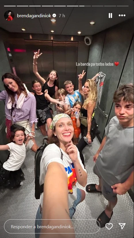 "La banda para todos lados", escribió Brenda sobre una selfie grupal tomada en un ascensor gigante que compartió en sus historias de Instagram. En la postal aparece ella con sus hijos, Eloy (13) y Alfonsina (7); Paula con Olivia (11), Baltazar (8) y Filipa (4) y Sabrina con Esperanza (11) y Fausto (9).